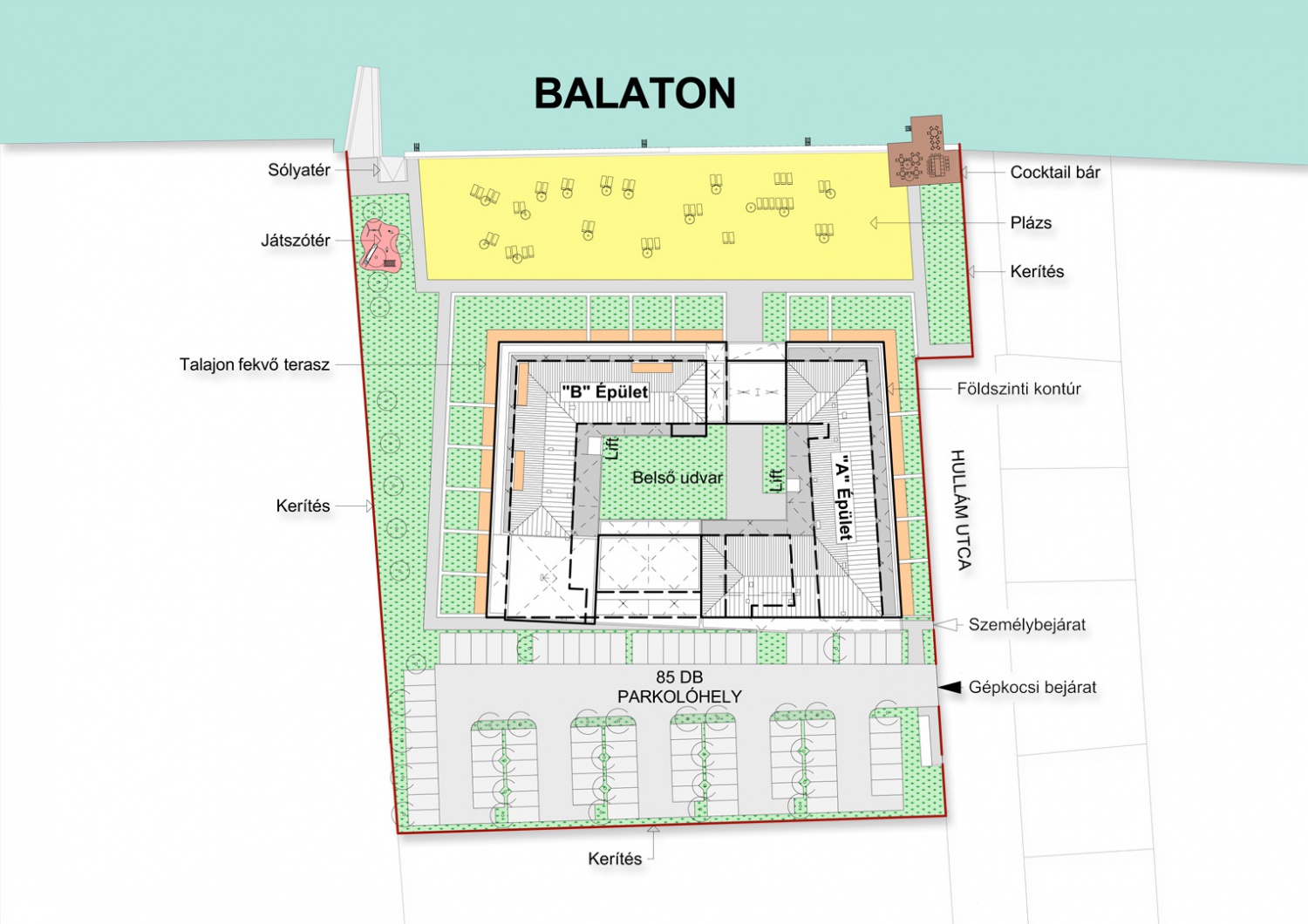 Változatos méretű és elrendezésű lakások mindegyike Balatonra néző, panorámás erkéllyel, a földszinti lakások kertkapcsolattal is rendelkeznek.